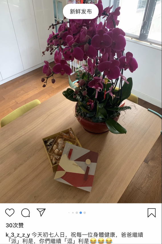 另一张全家福中两姐妹穿着拜年服,郭可颂熊黛林穿着简单的居家线衣,四个人凑到一起拍照,lyvia表情可爱,kaylor笑起来特别甜美,两姐妹手上都拿着红包,喜气洋洋。