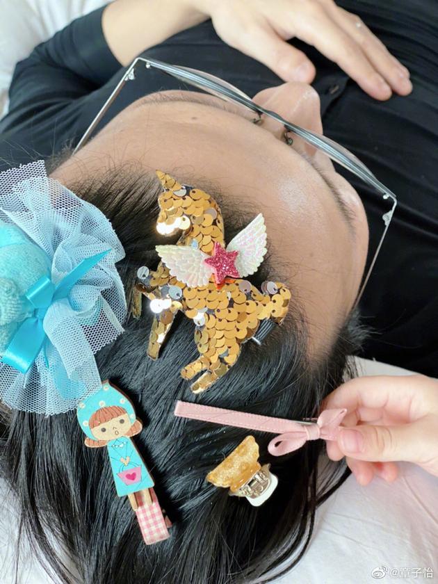 在晒出的两张图片中,其中一张是玩具兔子的长耳朵夹满了各种彩色发夹,另一张则是醒醒正在给汪峰的头发上夹满五颜六色的各式发夹。有网友将汪峰错认成章子怡评论道:“原来女明星也不洗头。”章子怡还幽默回复:“是男明星。”而对于有网友指出已经过了2月29日了,章子怡则逗趣回复:“网速太慢”。