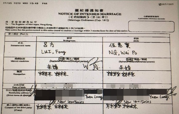 新浪娱乐讯 据香港媒体报道现年56岁的艺人吕方,与年纪相差16岁的女友伍惠宝(Rainbow)好事近,女方已怀有五个多月身孕,双喜临门。二人正式入纸排期注册结婚。拟结婚通知书曝光。