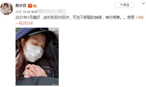 网易娱乐1月4日报道 1月4日,蔡少芬在微博分享了一张自己靠在老公怀里的照片,说道:“2021年1月真好,终于盼到你回来,可在不舒服的时候,有你倚靠。感恩!”照片中蔡少芬戴着白色口罩,头戴棒球帽,闭着眼睛靠在老公张晋的怀里,张晋还紧紧握着她挽在自己胳膊上的手,两人十分甜蜜。