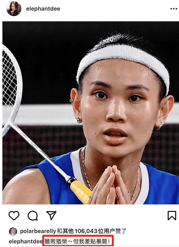 她在其社交平台上发布了这样一条言论,她说“虽败犹荣,但我差点暴毙”,然后配上台北选手戴资颖的照片。这番言论引起了内地网友的不舒服。