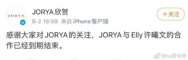 服装品牌JORYA也宣布与小S大女儿许曦文的合作到期结束。