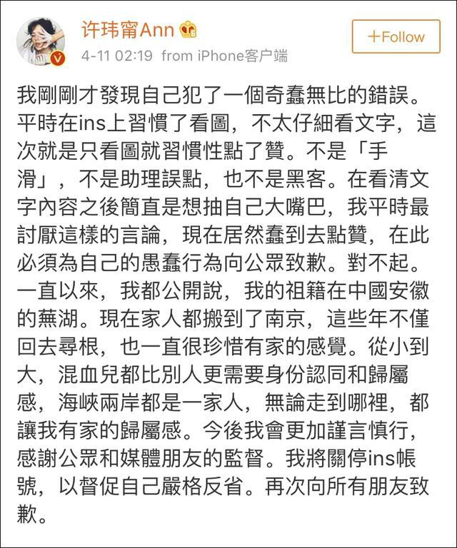 2019年4月11日,中国台湾女艺人许玮宁就此前点赞了ins上疑似内涵大陆同胞的“台独”言论作出解释,表示自己所犯错误“奇蠢无比”,是因为“只看图就习惯性地点了赞”。并强调自己祖籍在中国安徽芜湖,在此必须为自己的愚蠢行为向公众致歉。