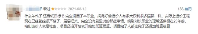 有从事造价的网友表示,现如今的造价工程管控已经十分严格,不存在看纸质标书,也不会出现电视剧里出现的那些狗血情节,这完全就是在给这个职业抹黑。