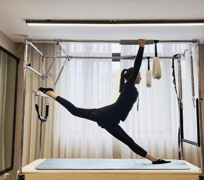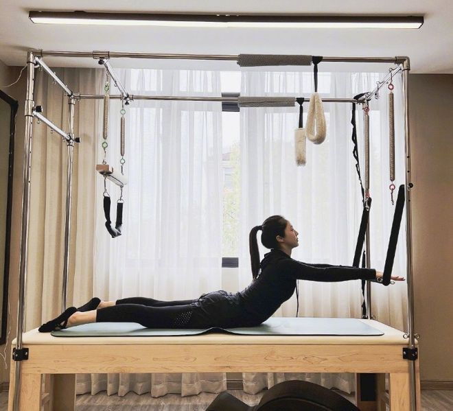 从照片来看,董璇对于健身可谓是相当专业。只见她身穿一套黑色紧身运动服,一双长腿绷得笔直,躺在专业器材上,两手扶着吊环,将身体舒展开来,虽然是素颜出镜,但她的皮肤看起来相当白净油亮,可见保养得相当不错。