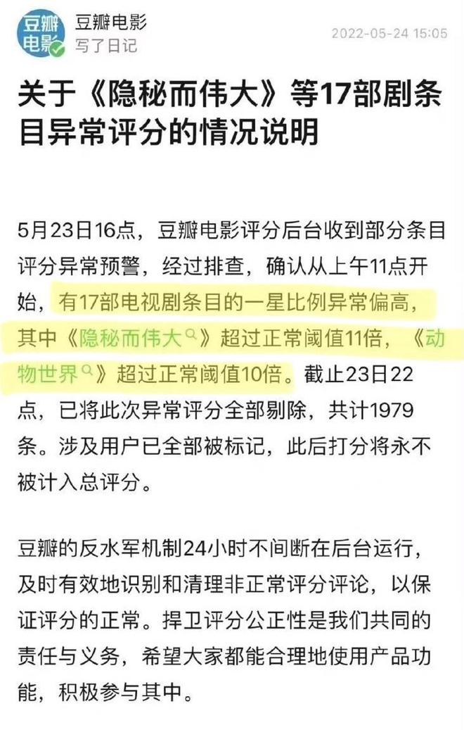 此前,豆瓣电影发布公告称李易峰参演的17部作品一星比例异常偏高,已将此次异常评分全部剔除。