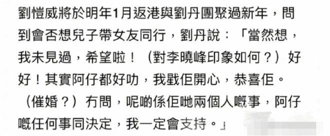 刘恺威将于明年1月返港与刘丹团聚过新年,问到会否想儿子带女友同行,刘丹说:“当然想,我未见过,希望啦!(对李晓峰印象如何?)好好!其实阿仔都好叻,我替他开心,恭喜他。(催婚?)没问,这是两个人的事情,儿子的任何事同决定,我一定会支持。”