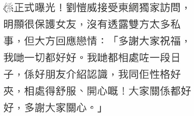11月19日,刘恺威在媒体采访中大方承认恋情,他透露与女友是通过好朋友介绍认识的,两个人性格很合,相处得非常舒服开心。