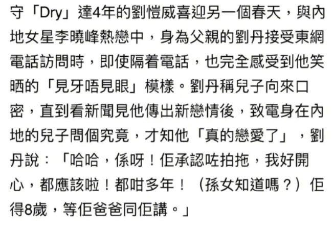 身为父亲的刘丹接受电话访问时,即使隔着电话,也完全感受到他笑得能看见牙的模样。刘丹称儿子向来口风很紧,直到看新闻见他传出新恋情后,致电儿子问个究竟,才知他“真的恋爱了”,刘丹说:“哈哈,是呀!他承认在拍拖,我好开心,都应该啦!都这么多年!(孙女知道吗?)她8岁了,等她爸爸同她讲。”