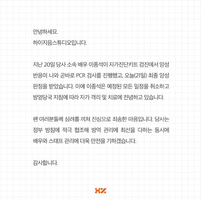 所属公司方面21日表示:“昨天20号本公司旗下演员李钟硕的自我检测试剂中呈阳性后立马做了PCR检查,今天(21号)确诊为新冠肺炎。因此李钟硕将取消所有预定的行程按照防疫局规定专注于自我隔离和治疗。让粉丝们担心真的十分抱歉,所属社将积极配合防疫局致力于防疫管理的同时也更加注重对演员和工作人员的管理做到万无一失。”