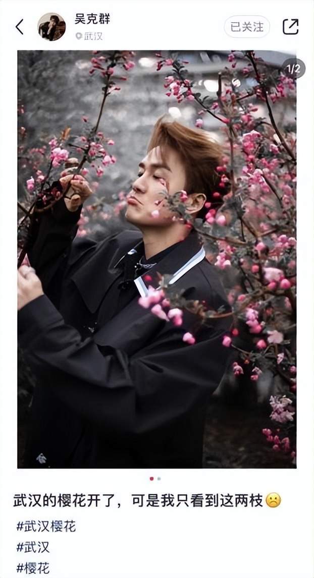 近日,吴克群在微博和小红书分别晒出一组与樱花合拍的写真图片,并配文“给你们明媚的花朵儿”,神秘的黑色西装与艳丽的樱花形成鲜明的对比,与之前走的文艺风格形成反差,看了直呼这不就是花海里走出来的“鬼怪”么!