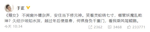 网易娱乐4月23日报道 4月23日,于正社交平台作诗《赠女》,疑似为白鹿发声。早前,白鹿因采访中“厌女”言论引发争议。随后,有网友在评论区问于正赵丽颖今年能不能拿白玉兰,于正回复:“她无论得不得奖,在我心里,同年龄段的女演员里,演技就是第一名,毋庸置疑。”