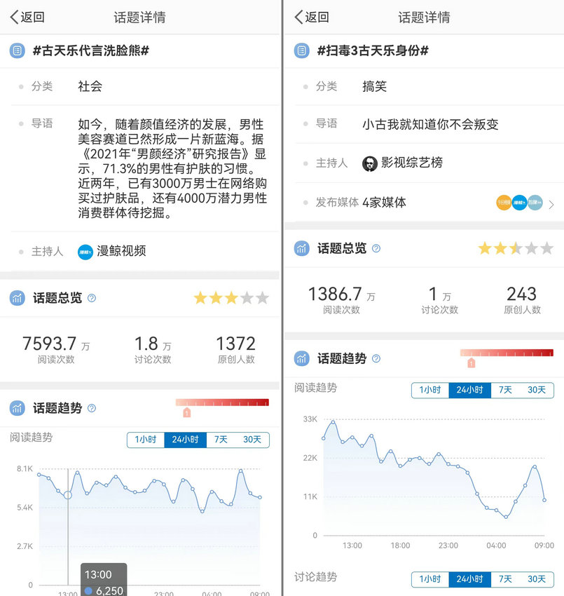 洗脸熊扩张势头如草原之火,目前店铺数量全国增至800+,同时古天乐代言海报遍布全国门店。近期古天乐出现在疯狂小杨哥直播间,抖音平台话题热度突破900万。如今洗脸熊引发1083.9万话题量,古天乐一下子成为了话题中心,沉寂多年的他可谓四年磨一剑,一朝出鞘势不可挡。