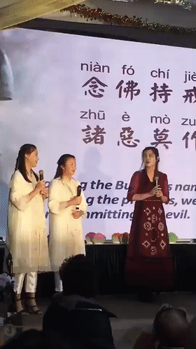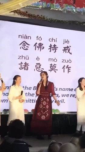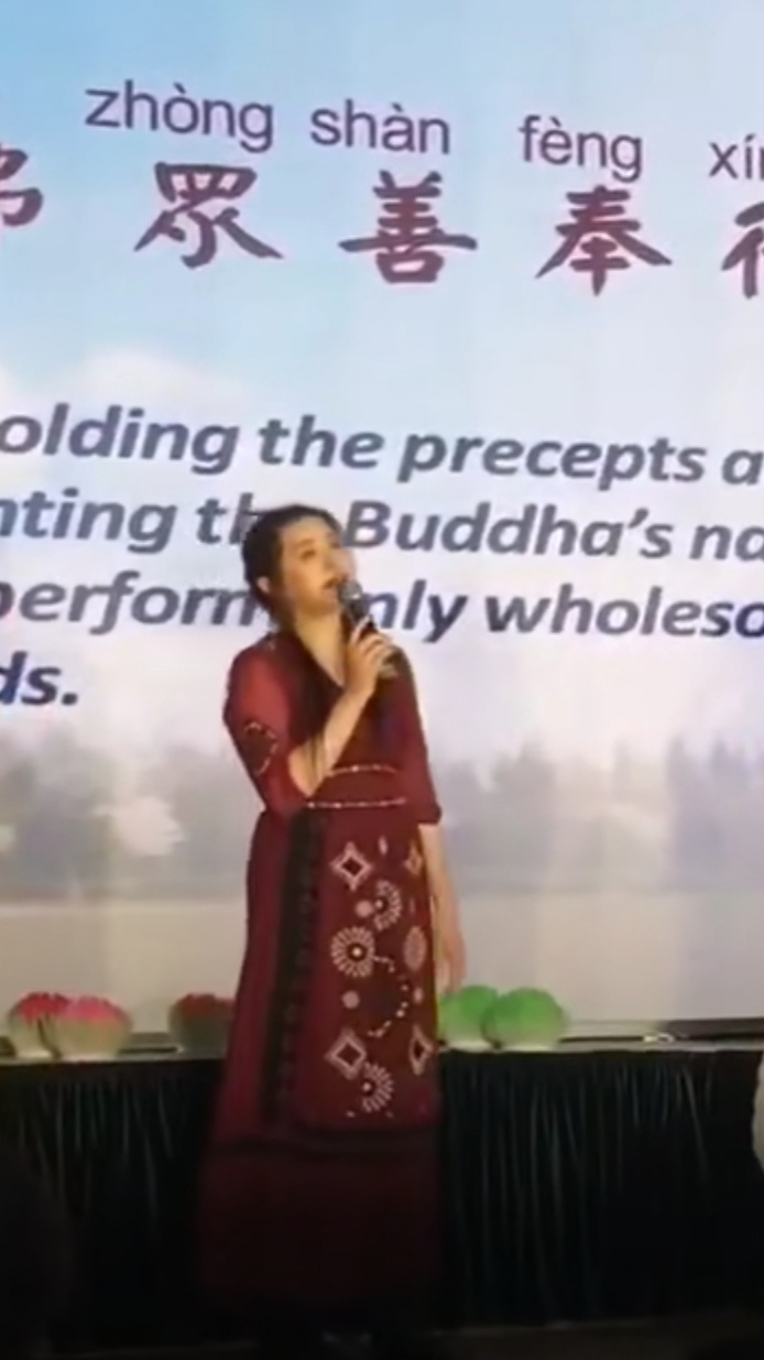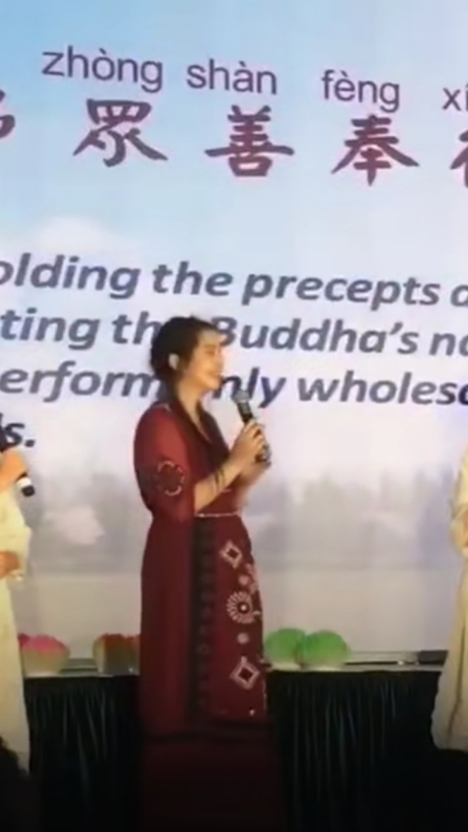新浪娱乐讯 近日,有网友晒出了一段王祖贤为温哥华灵岩山寺扩建组织募捐时上台诵唱经文的视频。视频中,王祖贤身穿深红色长裙,站在中间领唱,状态十分不错。
