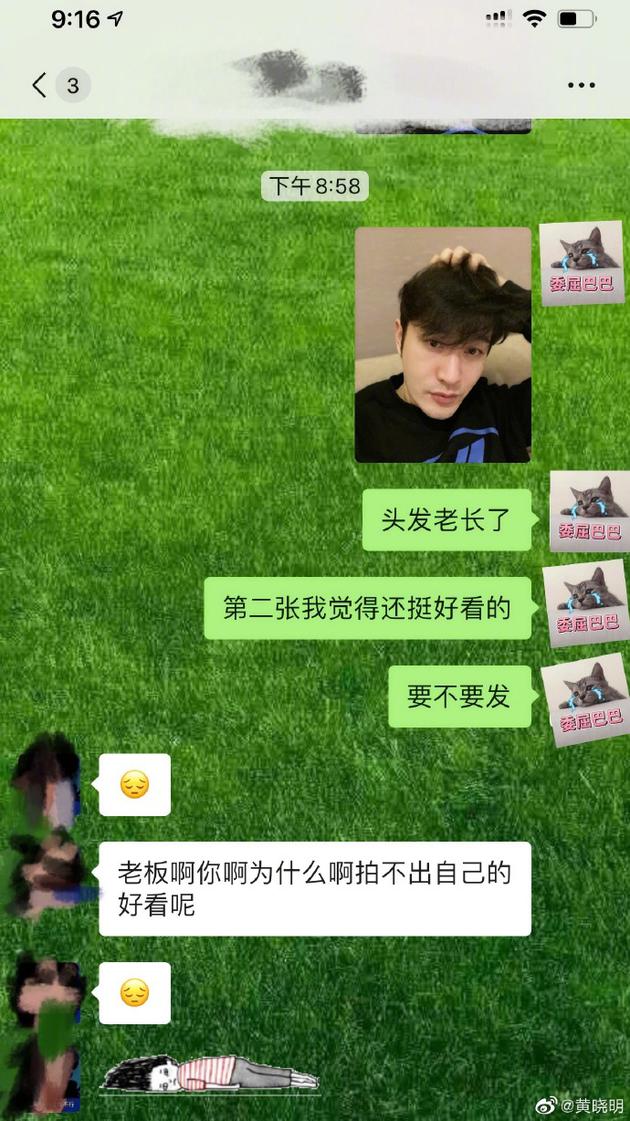 新浪娱乐讯 3月10日晚,黄晓明在微博晒出自拍照,以及和工作人员的聊天截图,无奈写道:“洗完头,自拍来了。在发的路上阻力重重!”照片中,黄晓明用手摸着长长的头发,素颜出镜十分清爽。在和工作人员的聊天中,黄晓明问可不可发自拍,工作人员却表示没有本人好看。