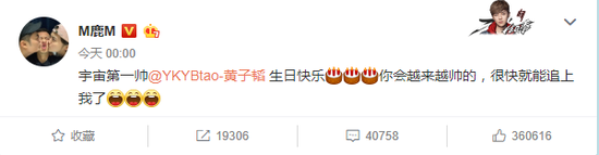 网易娱乐5月2日报道 5月2日是黄子韬27岁的生日,零点一到,鹿晗就在微博发文为好友庆生:“宇宙第一帅生日快乐,你会越来越帅的,很快就能追上我了。”黄子韬在评论中回复:“今天我变宇宙第一了吗鹿哥哈哈,蛋糕太美,爱你。”