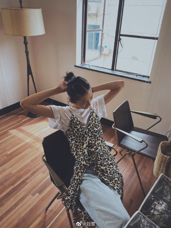 刘雯分享丸子头造型夏日美照 穿白T搭豹纹吊带优雅随性