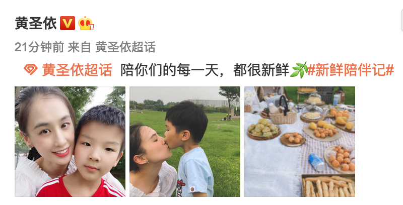 新浪娱乐讯 6月15日,黄圣依在微博分享陪伴两个儿子野餐的美好亲子时光,并发文:“陪你们的每一天,都很新鲜”。照片中黄圣依身穿白色娃娃衫,抱着大儿子对镜自拍,还与小儿子有爱玩亲亲,画面温馨幸福。