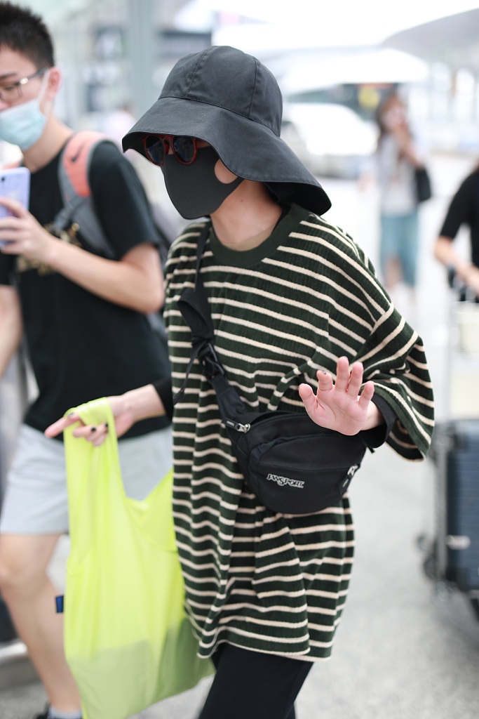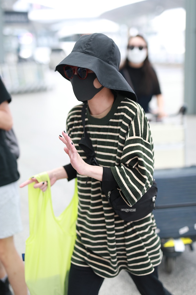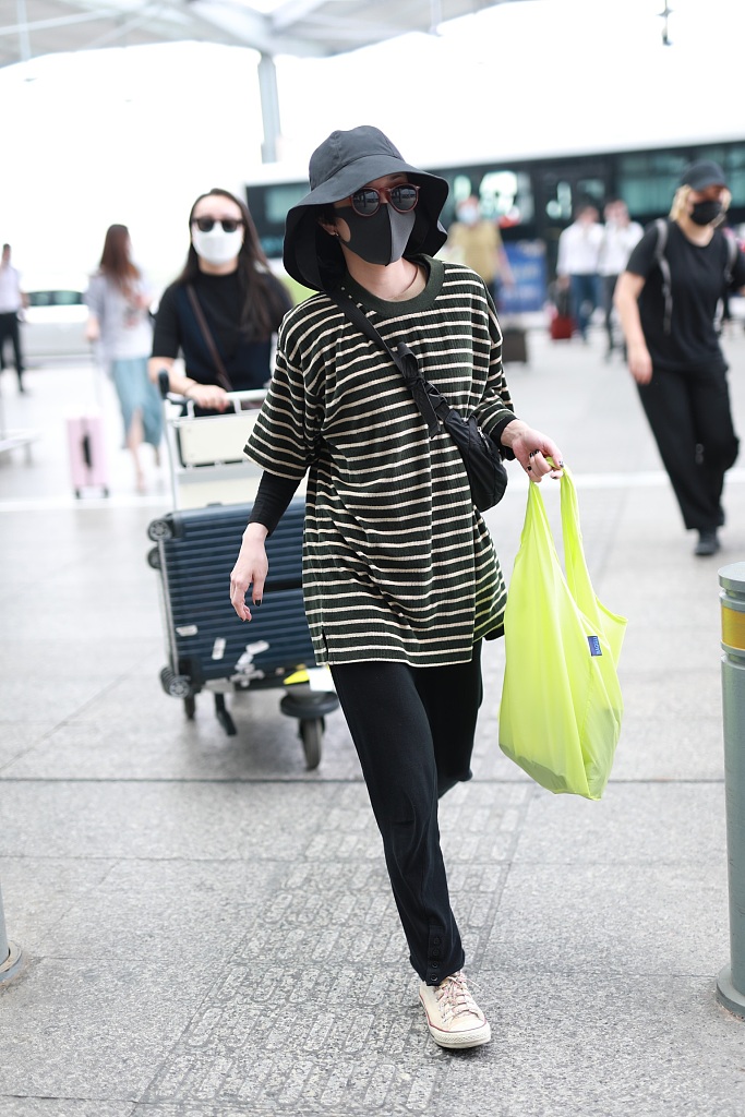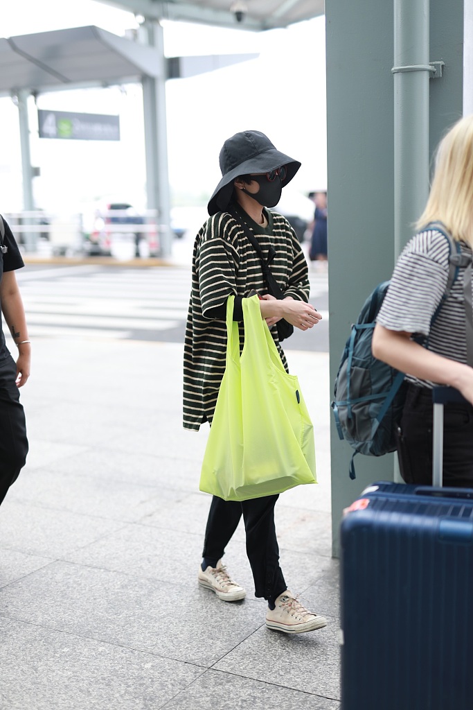 新浪娱乐讯 7月21日,上海,郭采洁现身机场。她戴着黑色遮阳帽身穿条纹上衣十分休闲,挎着荧光色兜兜十分抢镜。