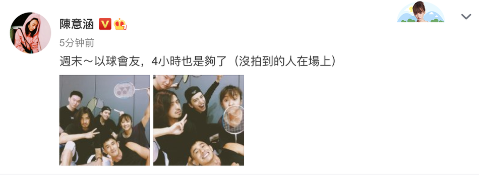 陈意涵晒与陈柏霖王大陆同框照 周末聚会打羽毛球超开心