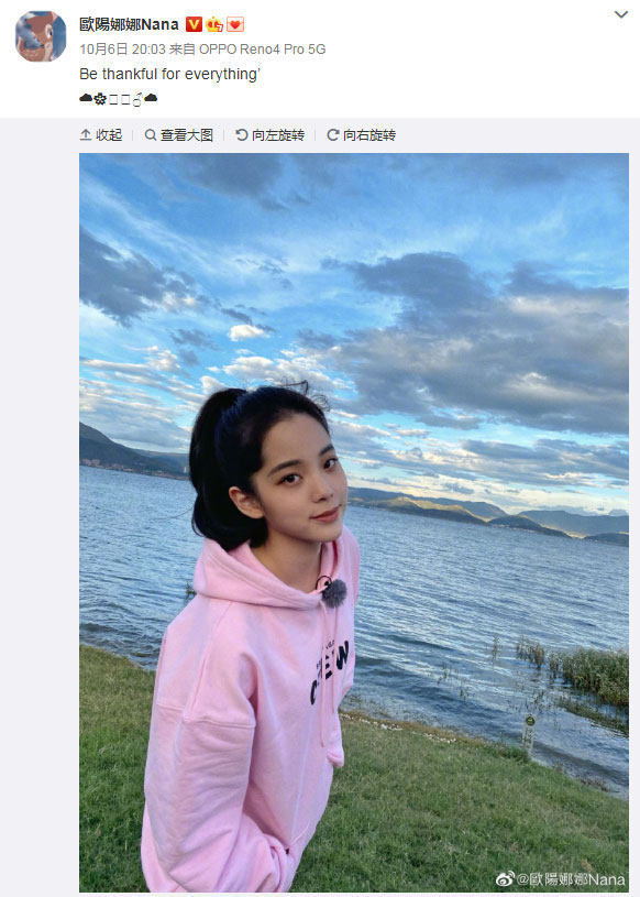 6日晚,欧阳娜娜晒出自己在湖边漫步的照片,并配文“Be thankful for everything”。