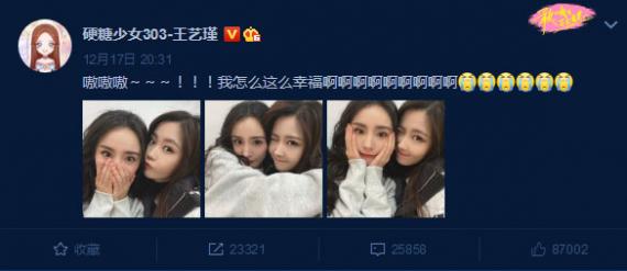 17日晚,硬糖少女303的王艺瑾晒出自己与杨幂的合照,并称“我怎么这么幸福啊”。