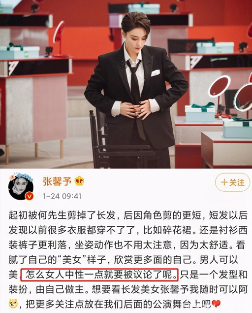 张馨予,这个向来以美艳性感著称的姐姐在浪姐节目中竟然是一副酷帅女生的模样,短发加笔挺的西装,配上举手投足间爽利的动作,与与之前塑造了多年大美女形象的她判若两人,但是还没尝到翻红的滋味就吃了一记委屈,为此还特意发博倾诉自己受到了不公平待遇。