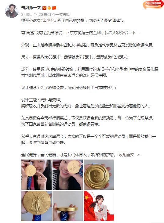 8月8日,孙一文在微博晒出多张东京奥运会金牌的细节照,并为大家仔细介绍了金牌的设计理念,同时表示:“希望大家通过这次奥运会,喜欢的不仅是一个个可爱的运动员,而是跟随我们一起,参与到体育运动中来。全民健身,全民健康,才是我们体育人,最终极的梦想。”