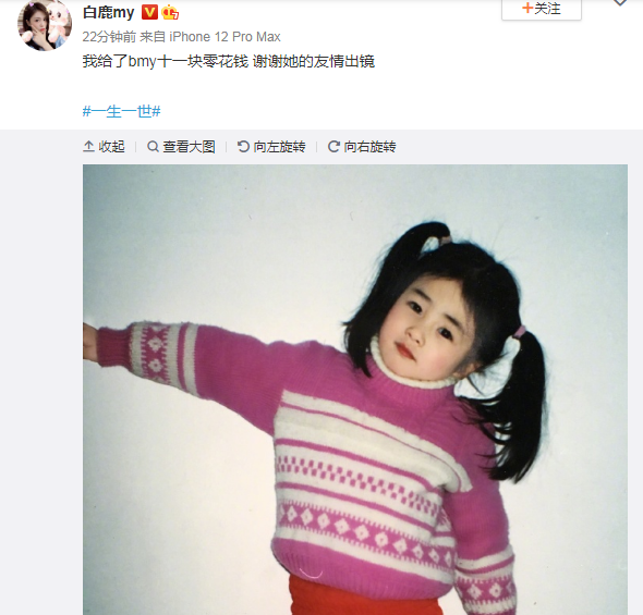 由白鹿主演的《一生一世》热播,剧中出现了白鹿小时候的童年旧照引发热议,9日,白鹿在微博晒出童年照的高清版本,调侃:“我给了bmy(白梦妍)十一块零花钱,谢谢她的友情出镜。