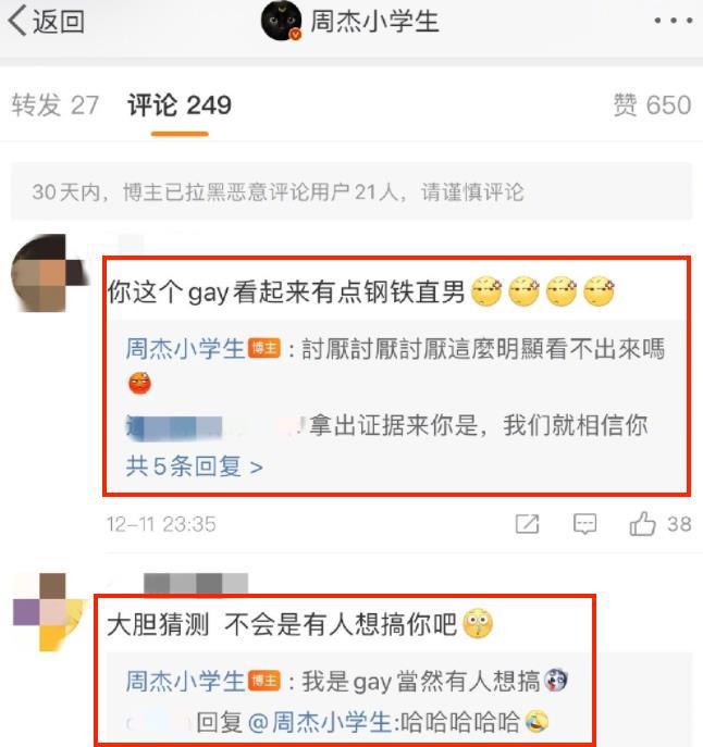 随后,周杰还在评论下面称自己是gay,有人想搞他。