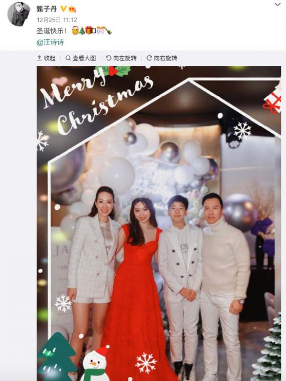 12月25日,甄子丹晒出全家福照片并艾特爱妻汪诗诗,照片中,甄子丹现年13岁的小儿子身高已经赶超老爸。