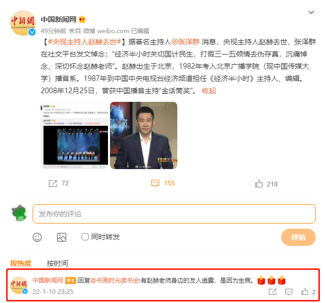 1月10日晚,央视主持人张泽群发微博称,央视著名主持人赵赫去世。