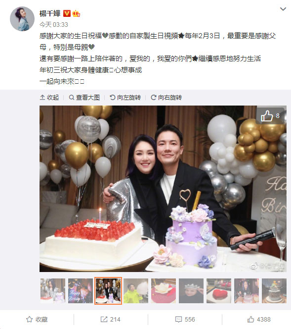 4日凌晨,杨千嬅晒出与老公的合影庆生,并称“感谢一路上陪伴着的,爱我的,我们的你们继续感恩地努力生活”。