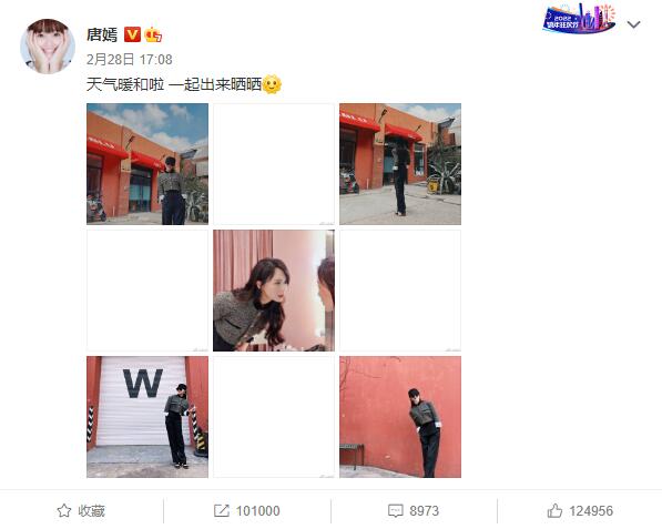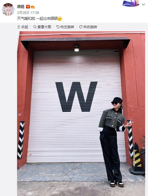 28日,唐嫣分享随拍美照:“天气暖和啦,一起出来晒晒太阳。”照片的她戴着墨镜衬托出白皙的皮肤,一双长腿十分抢镜。