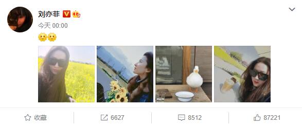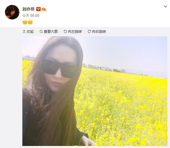 17日,刘亦菲卡点晒出一组自拍美照,她戴着墨镜置身于油菜花海,皮肤白皙又美又飒。