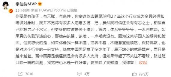 16日,李佳航发文谈国足,他表示当前国足确实在困境,如果是球迷则有一定自由去批判,但大众如果像自己一样不懂或者不看足球,就不要随意宣泄愤怒,保持沉默也是对这个行业的一份支持。李佳航也直言“毕竟中国足球臭了多少年了,最不缺少的就是骂声,而且是越来越差。但如果带起了不关注不看球,路过随口喷一嘴的风潮,我觉得也不是一件好事。”