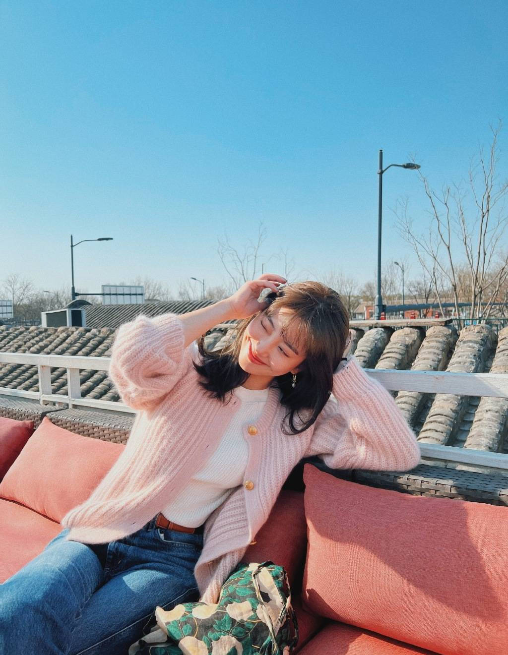 杨采钰晒甜美春日照 穿针织开衫舒适惬意