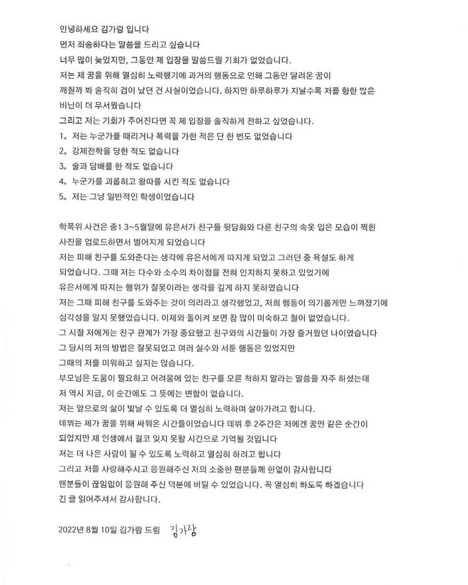 网易娱乐8月11日报道 韩国女子组合LE SSERAFIM前成员金佳蓝在社交平台发长文回应校园暴力争议,否认自己曾参与校园暴力。她强调自己只是个普通的学生,一次也没有打过某人或者施过暴力,没有被强制转学过,没有抽烟喝酒,没有欺负过别人,孤立过别人。