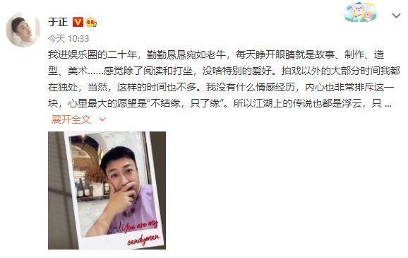 我进娱乐圈的二十年,勤勤恳恳宛如老牛,每天睁开眼睛就是故事、制作、造型、美术……感觉除了阅读和打坐,没啥特别的爱好。拍戏以外的大部分时间我都在独处,当然,这样的时间也不多。我没有什么情感经历,内心也非常排斥这一块,心里最大的愿望是“不结缘,只了缘”。所以江湖上的传说也都是浮云,只能笑笑。后来有了经纪这一块就把感情全部投射到艺人身上了,把他们看得比命还重要,这才体验到付出的快乐,我觉得我大部分时间像纵容孩子的父亲,陪伴玩耍的哥哥,可以豁出命去保护的长辈,这里面不仅仅有我家艺人,还有我捧起来的所有小朋友。2017年我才开始逐渐进入社交,交了很多好友,感情一直很好,直到今天。2019年我开始有很多圈外的朋友,各行各业,非遗匠人等等……我再审视自己,觉得太渺小和浅薄了,艺术终究是来源于生活啊!所以未来的日子一定要专注再专注,电视剧、小说涉及专业领域的,先考证再动笔,活到老学到老才是王道。得失心没那么重要,热搜不过是游戏人间。愿我有朝一日学以致用,帮助更多的人,我的剧集,我的小说才有意义。最近计划:学一门专业,锻炼身体,把我训练演员的过程拍成视频给大家看,太多人问我能不能签,有什么条件?那么我可以让大家看到风光背后的辛苦。另外就是新剧在筹备中了,我极爱的一本小书,希望带给大家新的视觉和体验,今儿本来要截个图催人还钱的,想想每天热搜也怪惹人讨厌的,还是先放过那个利用我善良,说话不算话的过气流量吧!话说张颂文的你都还了,啥时候还我?要上热搜吗?嘻嘻!暂且总结一下吧,当是给自己重返校园的一次鼓励和加油!