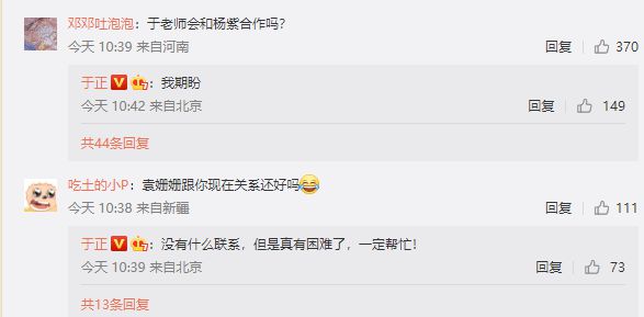 被问到会不会和杨紫合作时,于正表示自己很期盼。被提及和袁姗姗的关系是否还好时,于正则称没有什么联系,但是真的有困难的时候一定会帮忙!