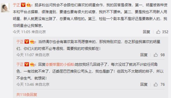 于正还在评论中与网友互动,他表示很多明星被各种资本和平台占据,很难请,另外就是如果自己不用新人的话新人就更加没出路了,也认为检验一个新剧好不好还是要靠新人,他担心请明星会让自己懈怠。