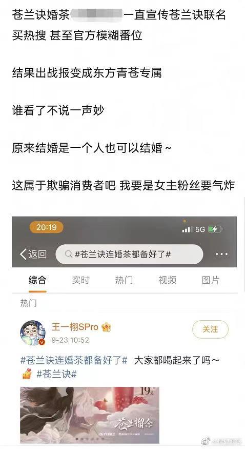 据悉,某茶品牌与《苍兰诀》男女主联名新出一款“婚茶”,王一栩发海报主动让粉丝购买。随后海报战绩却只写了“东方青苍”同款,引发不少网友争议,觉得既然是“婚茶”就应该写两个人的名字。