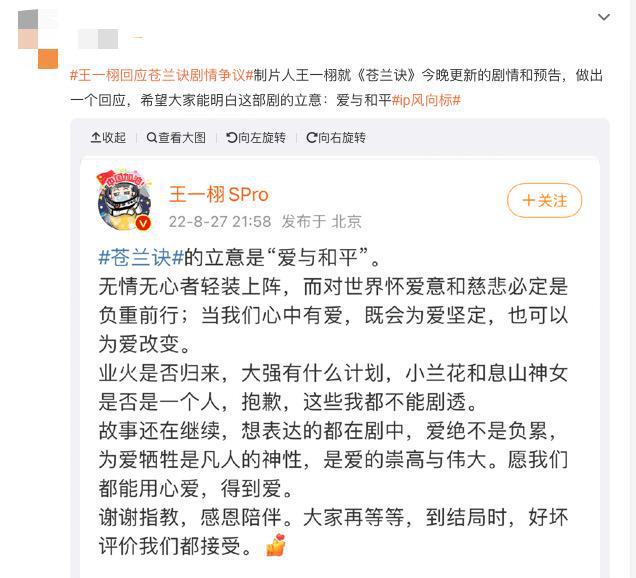 此前《苍兰诀》因剧情也引发过许多争议,王一栩便发文回应过。