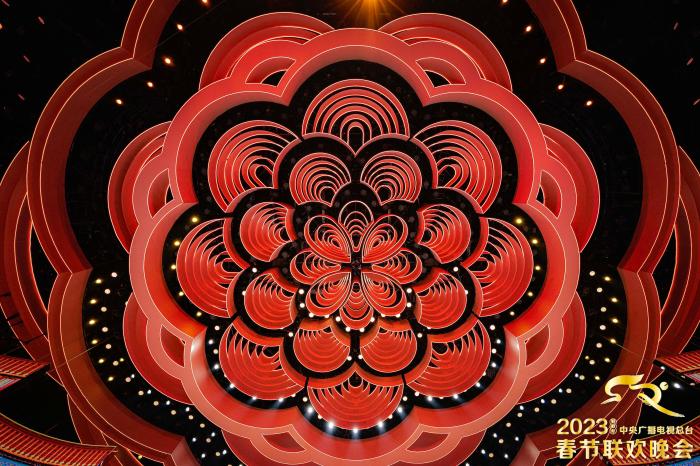 2023年春晚舞美设计体现“满庭芳”的理念,取意自中国古典文学词牌名,通过演播大厅多个方位的设计,共同营造祈愿圆“满”的中华大家“庭”尽展“芳”华的主题气象。其中,由四瓣花结构演化重构而成的演播厅顶部艺术装置,既是根植于中华文明的美学创造,又是绽放着现代设计理念的创新呈现。创意取材自距今6000年至4800年前的庙底沟彩陶标志性的“花瓣纹”,著名考古学家苏秉琦先生曾提出:花卉图案彩陶,可能就是华族(即华夏民族)得名的由来。