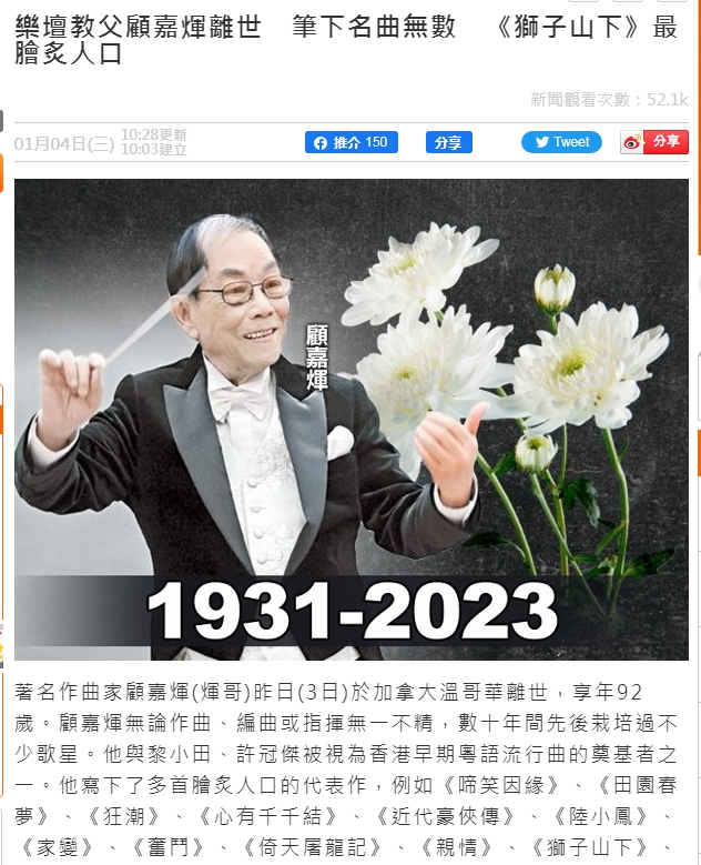 中新网1月4日电 据香港头条日报网、东网等香港媒体报道,2023年1月3日,香港著名音乐家顾嘉辉去世,享年92岁。