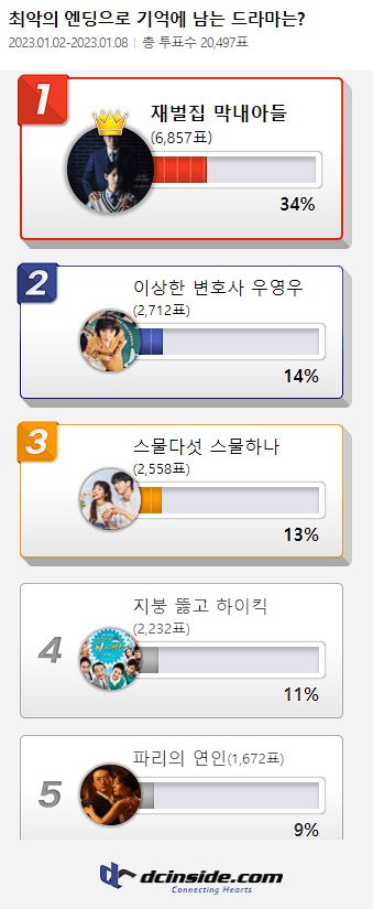 同样是去年热播的《非常律师禹英禑》,因后半段牵强的剧情和爱情戏而在此次投票中以14%的得票率排名第二位,《二十五,二十一》因男女主突然且欠缺说服力的分手而以13%的得票率排在了第三位。《穿透屋顶的high kick》与《巴黎恋人》分别排在了第四位和第五位。