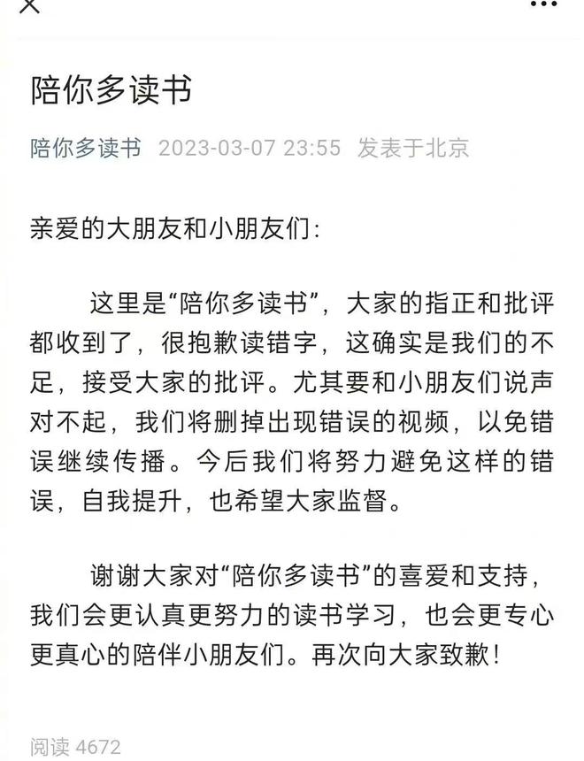 网易娱乐3月8日报道 7日,黄磊大女儿黄多多的读书公众号《陪你多读书》就黄多多读错字发文道歉,“大家的指正和批评都收到了,很抱歉读错字,这确实是我们的不足,接受大家的批评。尤其要和小朋友们说声对不起,我们将删掉出现错误的视频,以免错误继续传播。今后我们将努力避免这样的错误,自我提升,也希望大家监督。”