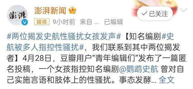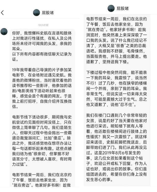4月28日,有网友发布匿名投稿,称著名编剧史航被曝疑似“性骚扰”。后陆续有网友发声,称自己或身边的人有过类似经历。