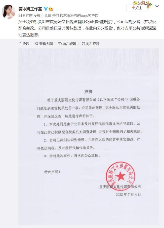 据悉,该公司的法定代表人是袁冰妍,此前公司涉嫌偷税漏税风波时,袁冰妍工作室曾发文道歉:“关于税务机关作出的处罚,公司深刻反省,并积极配合整改。公司目前已及时缴纳款项,在此向公众致歉,也对占用公共资源深深地表达歉意。”2022年7月3日,袁冰妍退出该公司法定代表人、执行董事兼经理职位,由张纯接任,大股东由袁冰妍变更为顾伟。