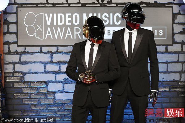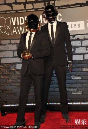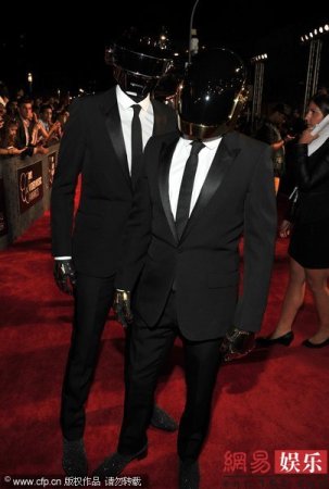 红毯礼对于男星们来说向来是个难以表现自我的地方,千篇一律的西装礼服、皮衣皮裤早已不稀奇,而休闲T恤牛仔裤也算日常。在本届MTV盛典上,来自法国的电音组合DaftPunk则堪称“奇葩”,同样是西装革履,不过戴着未来感十足的头盔面具以及金属感手套的二人,看起来像两个未来战士,抢镜成功,称为当天红毯最热门明星之一。